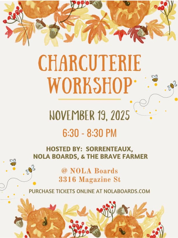 Join us for the first-ever collaboration between NOLA Boards, Sorrenteaux, and The Brave Farmer! Learn how to create a stunning, seasonal charcuterie board with expert styling tips from Ashley of Sorrenteaux, and discover the art of honey pairing with local beekeeper Amanda of The Brave Farmer. Sweet, savory, and perfectly seasonal—this is one workshop you won’t want to miss.