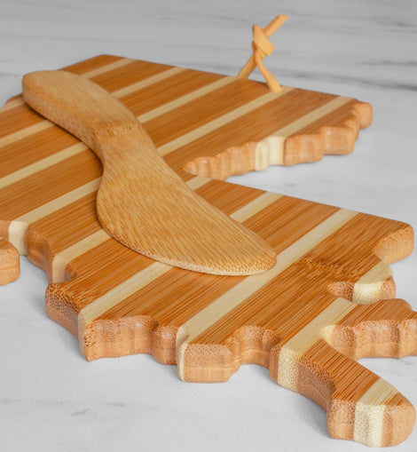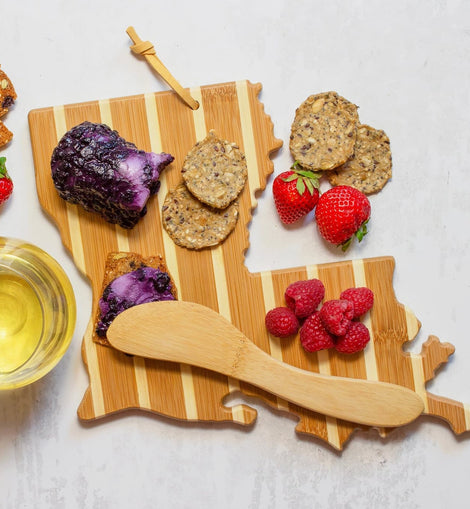 Celebrate Louisiana in style with this Louisiana-shaped Bamboo Cheese Board & Spreader Set—a charming and functional addition to any gathering.