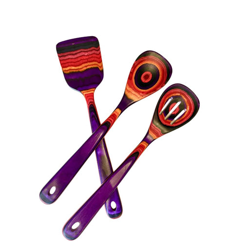 Bring bold color and modern craftsmanship into your kitchen with our Rainbow Layered Wood Utensil Set. Made from durable, food-safe laminated hardwood, each piece features striking layers of purple, red, orange, and natural wood tones—creating a one-of-a-kind pattern that’s as functional as it is eye-catching.