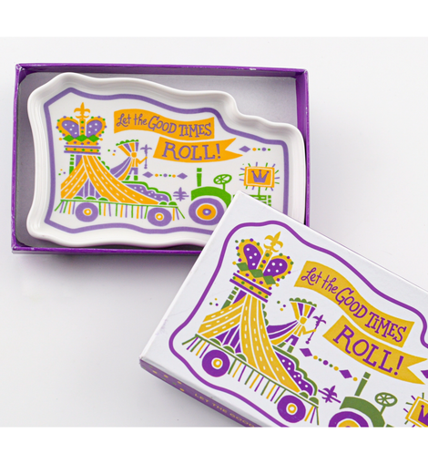 Our new trinket tray in the shape of a Mardi Gras float, features a fun, "Let the Good Times Roll", design by artist, Denise Gallagher.