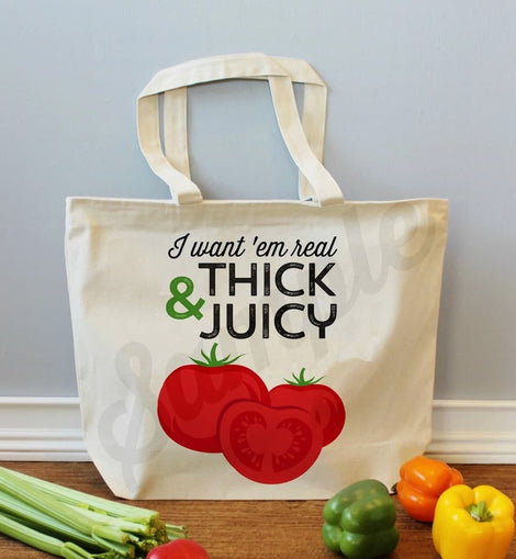 This “Thick & Juicy” Tomato Tote Bag is equal parts playful and practical. Featuring a bold tomato graphic and cheeky phrase, it’s the perfect reusable bag for farmers markets, grocery runs, or everyday errands.