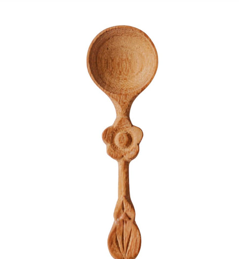 Delicate and functional, this 4” Flower Handle Mini Spoon is a beautifully hand-carved piece designed to elevate everyday moments. Crafted from solid wood, the sculpted floral detail adds a subtle decorative touch while highlighting the natural grain—making each spoon one of a kind.