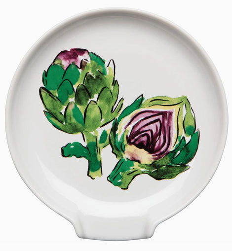 This delightful Artichoke spoon rest is a welcome addition to any kitchen. A motif adds character, while a divot allows spoons to rest comfortably. Nature’s artistry meets farm-to-table living in our Artichoke collection. Painterly watercolor, expressive ink details, and hearty purples and greens elevate gourmet endeavors. Dimensions: W5.25 x L5.5in Material: 100% Stoneware Care Instructions: Dishwasher safe.