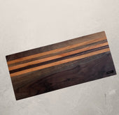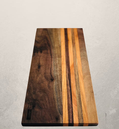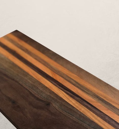 Crafted from rich walnut hardwood with beautiful cherry stripes, this board brings warmth, contrast, and natural elegance to your table. Its elongated shape makes it ideal for arranging cheeses, meats, fruits, and accompaniments—creating a stunning presentation with ease.