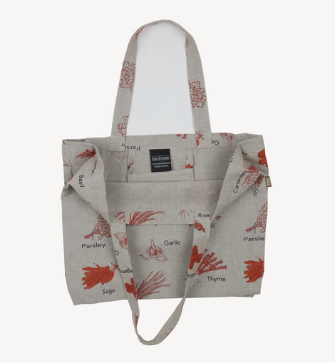 This spacious and fun shopping tote is made out of 100% recycled cotton, making it a sustainable choice for your everyday errands. Natural dyes are used to print the eye-catching Herbs pattern in Cinnamon. An inner pocket keeps your keys or phone handy.
