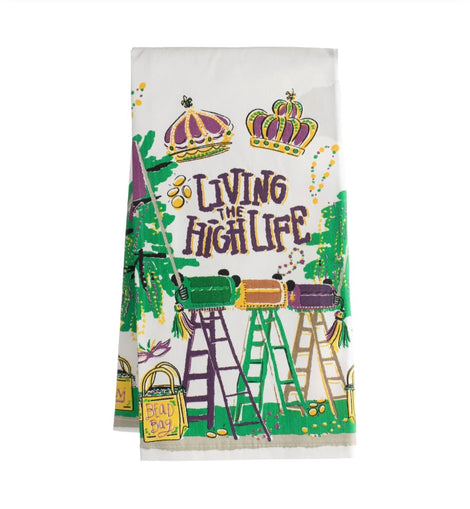 Bring a little Mardi Gras magic into your kitchen with the Living the High Life Kitchen Towel. Featuring a colorful, playful illustration inspired by classic New Orleans ladder throws, crowns, beads, and festive flair, this towel celebrates the joyful spirit of Carnival and life lived to the fullest.