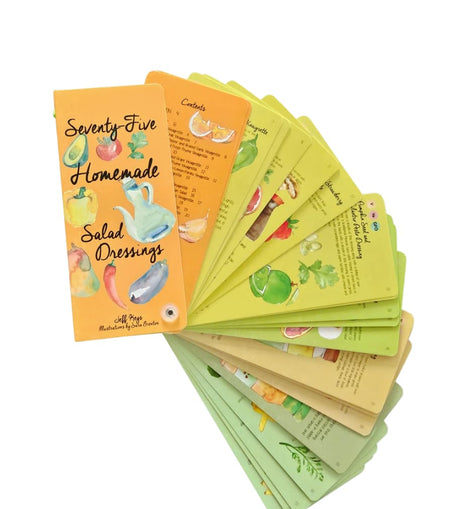 Discover endless ways to dress up your salads with Seventy-Five Homemade Salad Dressings by Jeff Keys, featuring cheerful watercolor illustrations by Sara Brenton. This compact, fan-style flip book opens into a full spread of bright, easy-to-follow recipes—perfect for quick inspiration in the kitchen.