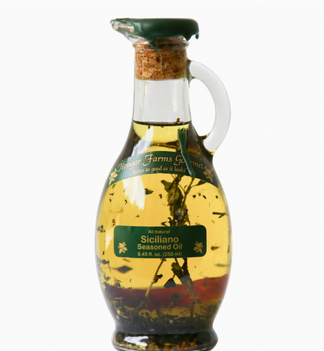 Hongar Farms Siciliano Oil is infused with fresh dried herbs, garlic and peppers, and serves as a great topping for light and flavorful pastas or drizzled over roasted veggies. This oil blend is also delicious as a marinade to add a burst of flavor to a basic chicken dish. Contained in their popular 250 ml Cruet bottle featuring a handle and lip for easy pouring.